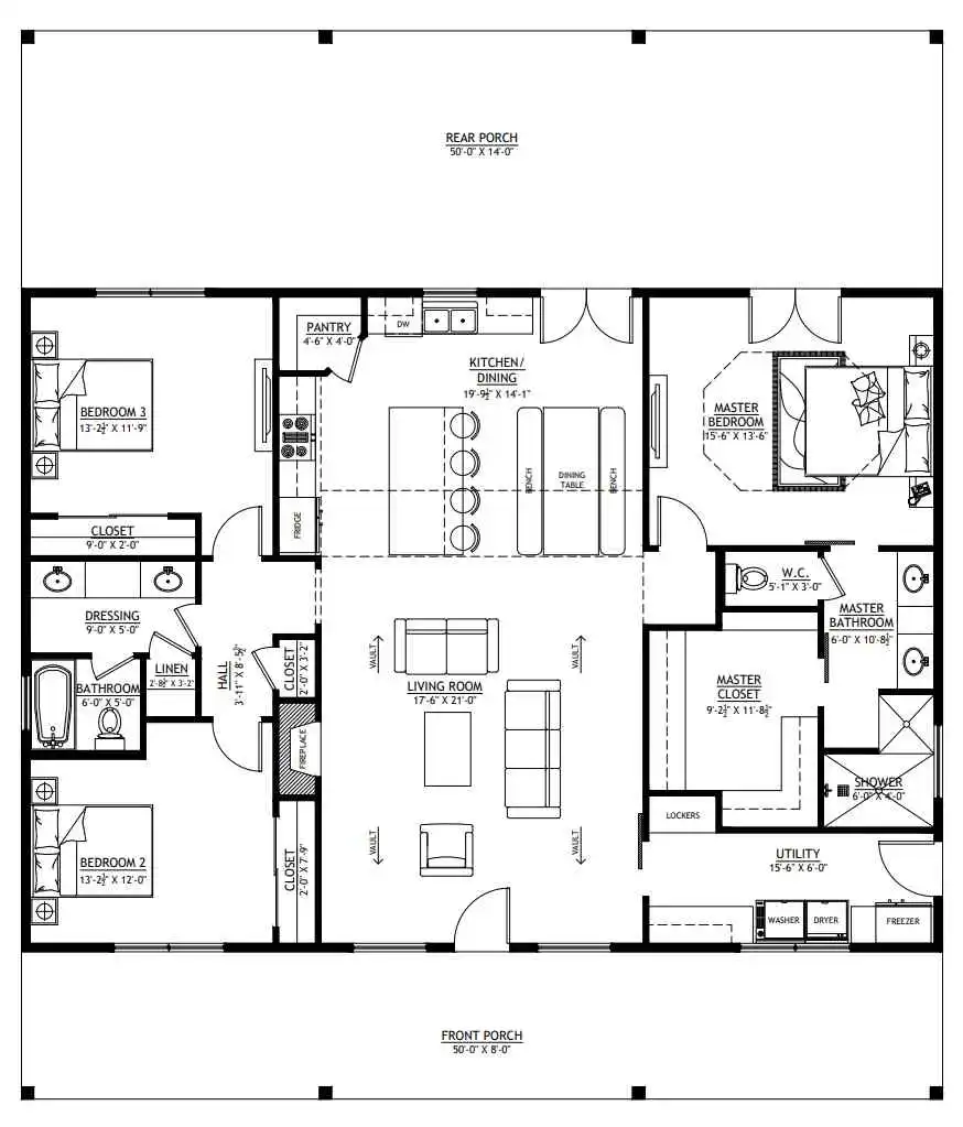 - This 1,800-square-foot layout stretches across a 36×50 footprint—designed for simple living with a clear, open flow and just the right amount of space to feel grounded and uncluttered.