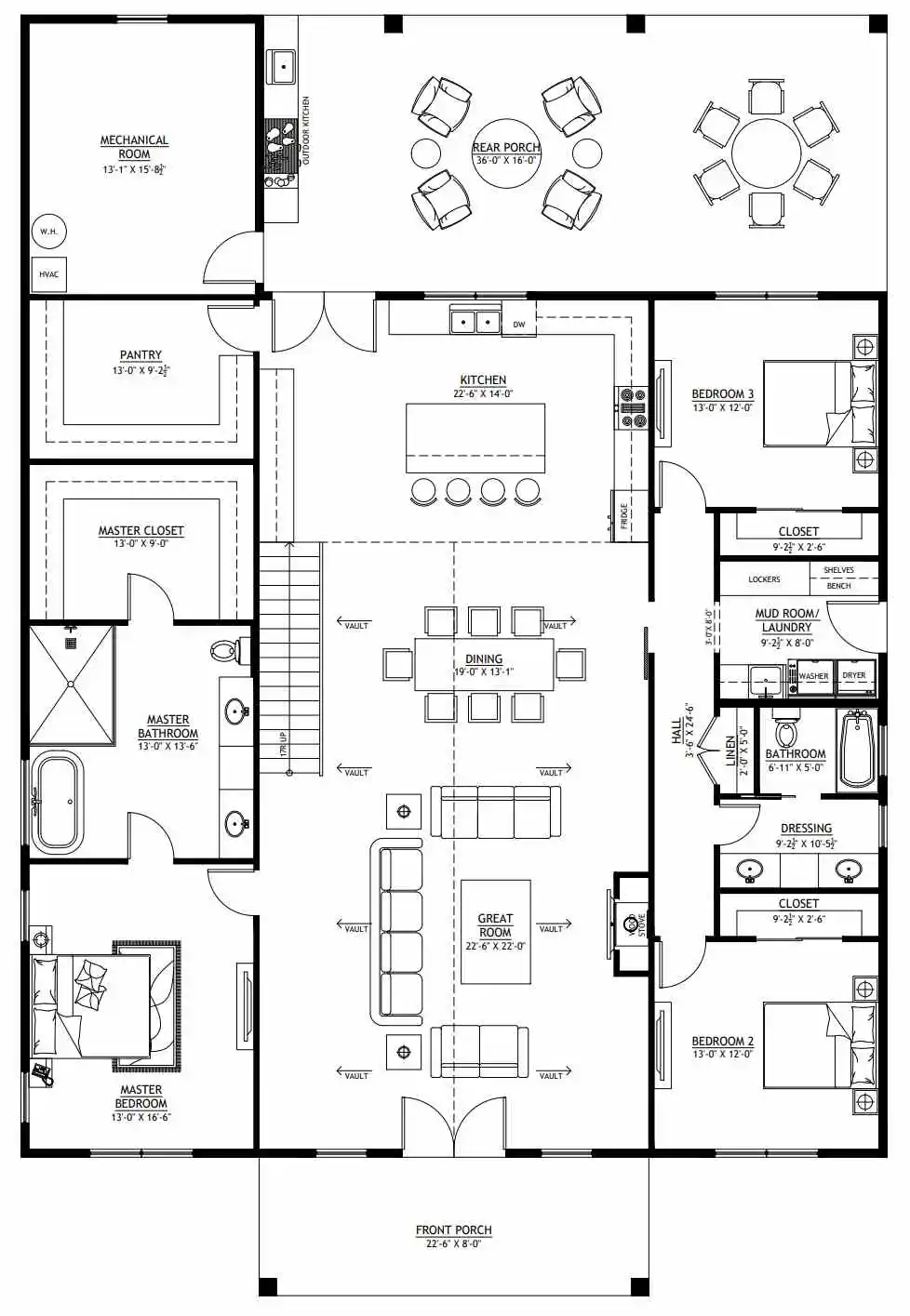 This design is a simple floor plan with a large shared living space. Notice that the bedrooms are closely spaced, so it’s not best if you’d like to keep your kids or guests on the other side of the house.