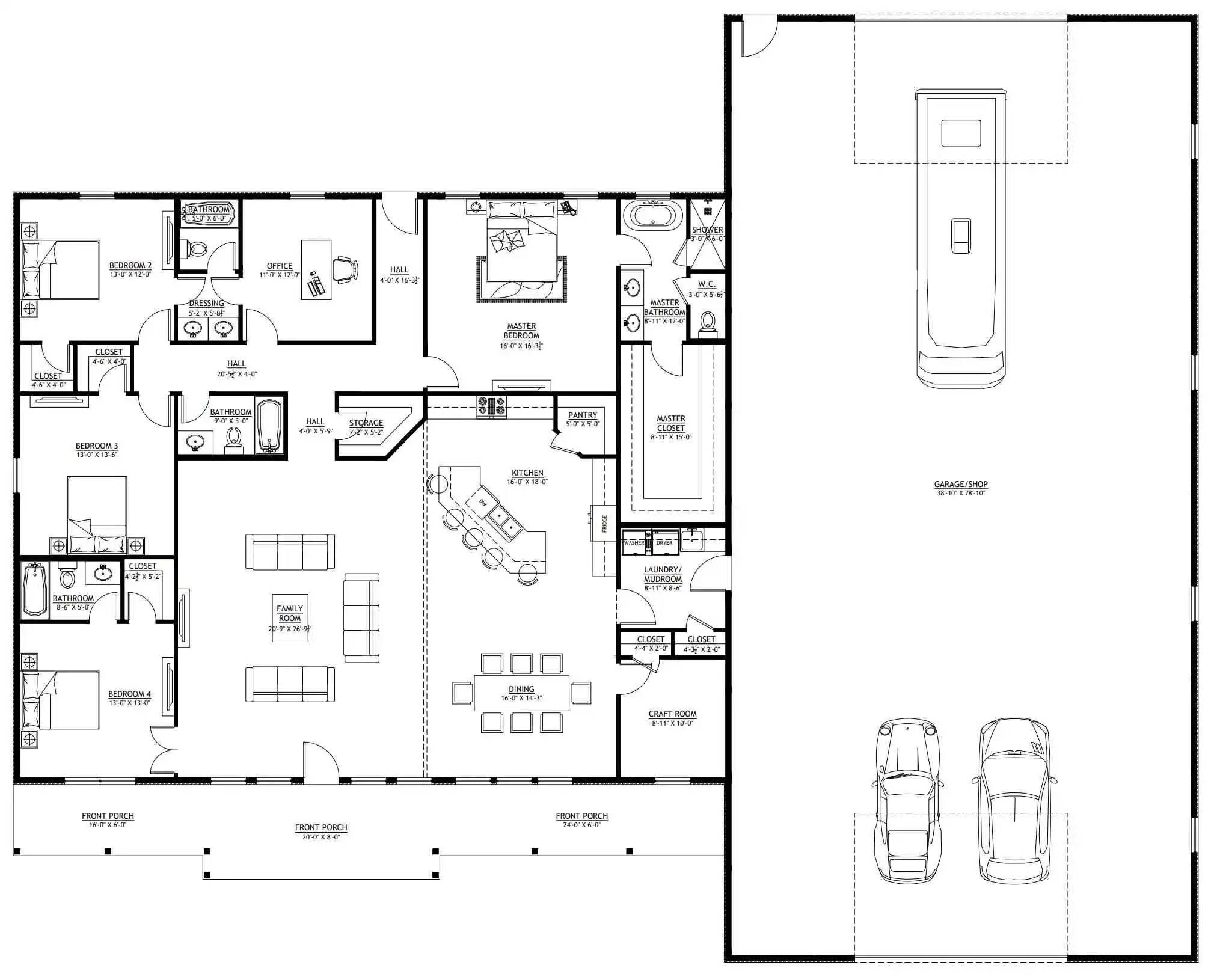 - Front, rear, and side porches