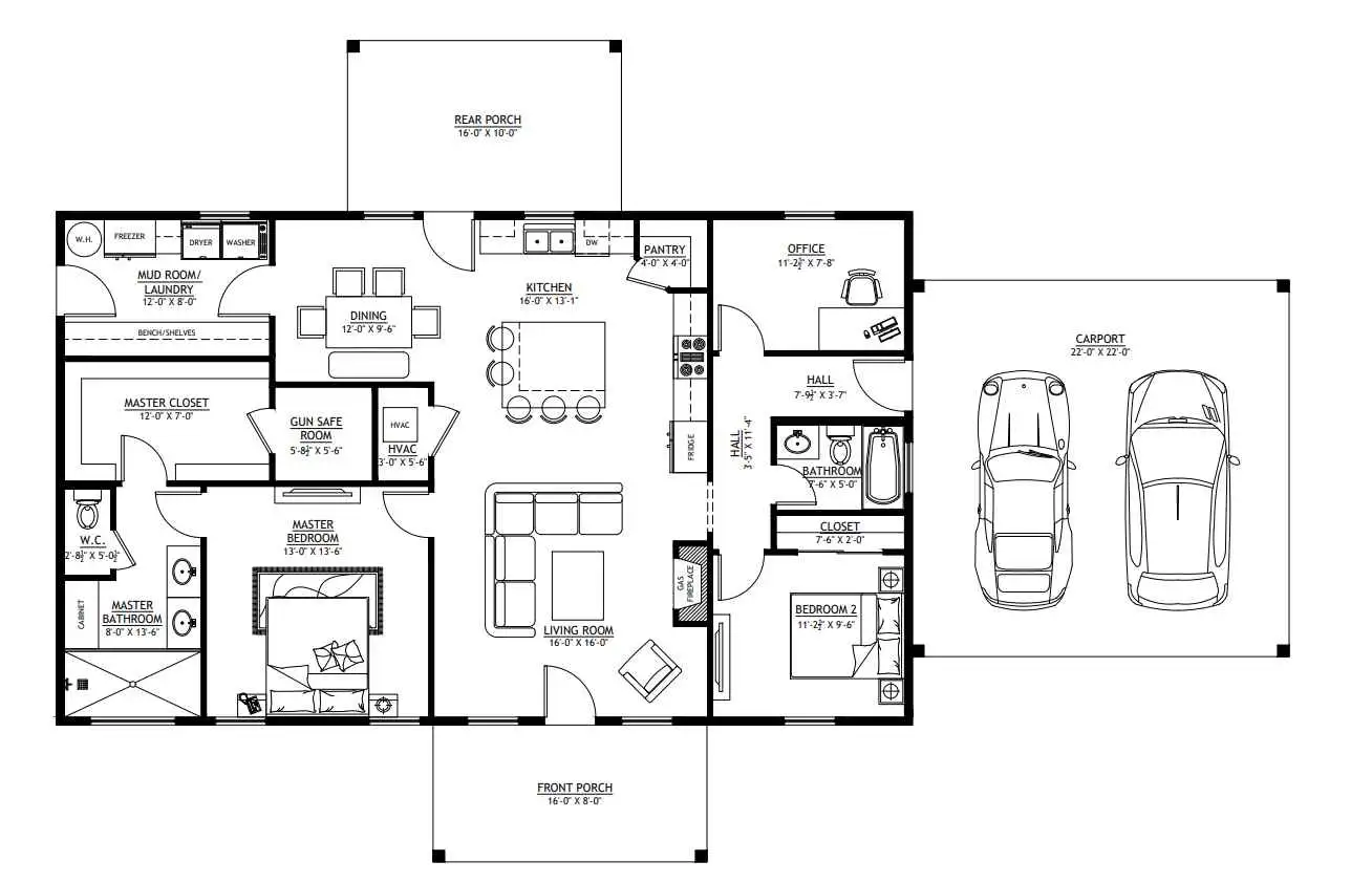 If you don’t necessarily need a garage, you can incorporate different things depending on your needs. These 1500 sq ft barndominium floor plans include a second bedroom in the space where the garage would be. This gives you enough space to include a large master bedroom and huge walk-in closet. If you only have guests now and then, this could be the perfect layout.