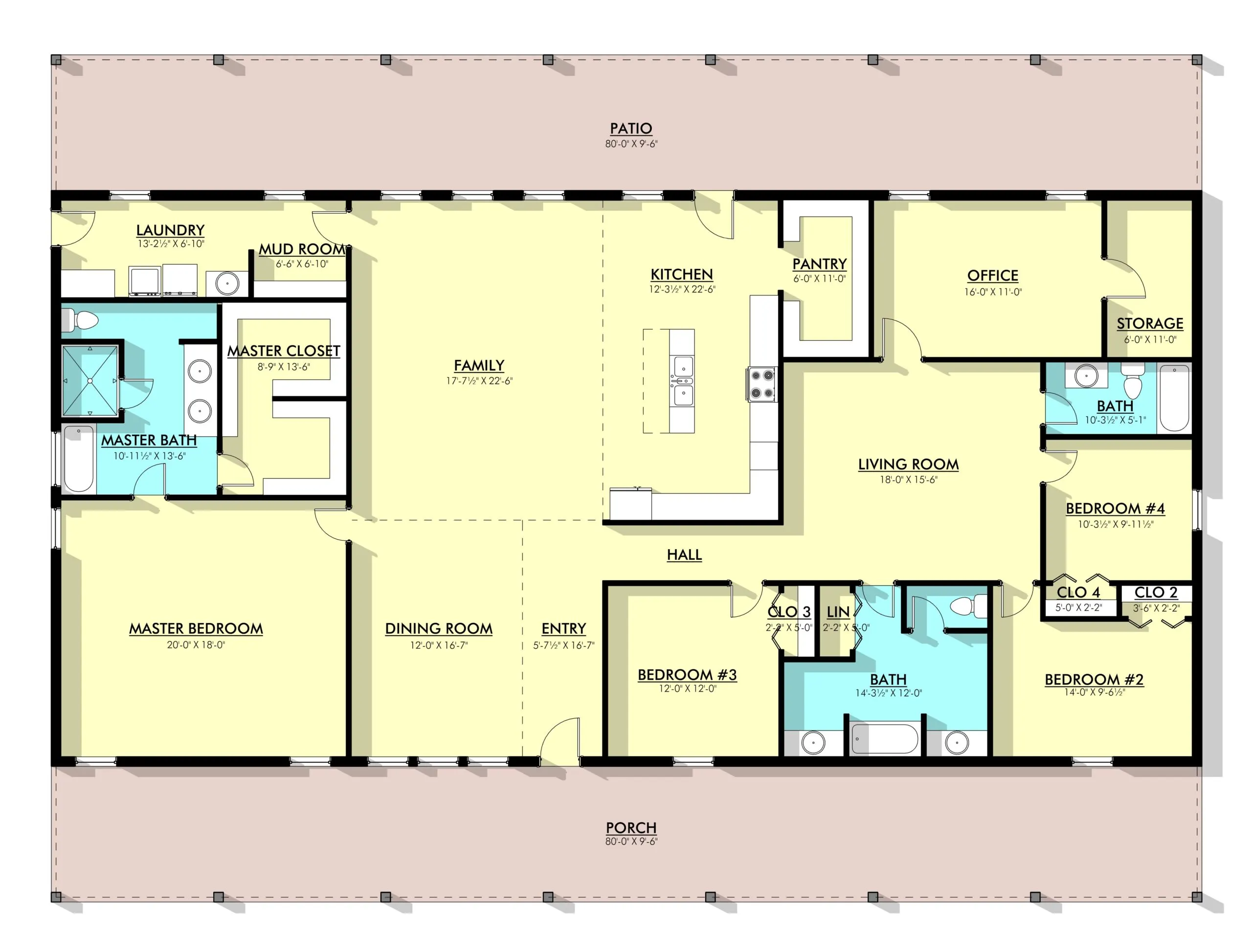 40×80 4 Bedroom + Office 2.5 Bathroom 1 Story Barndominium – PL61003