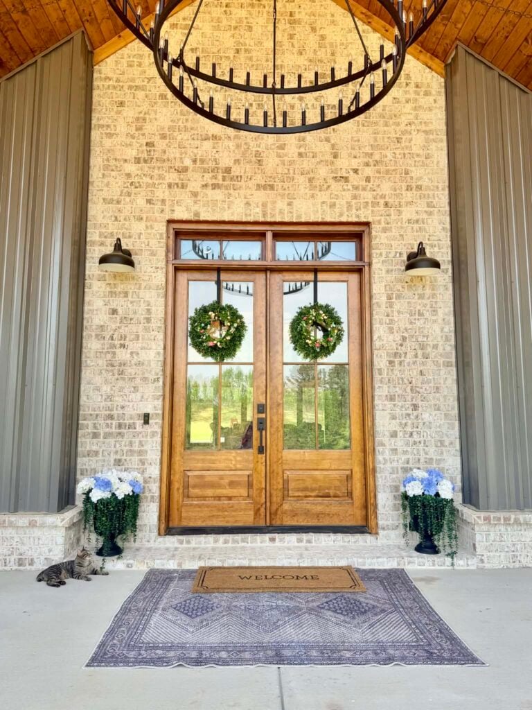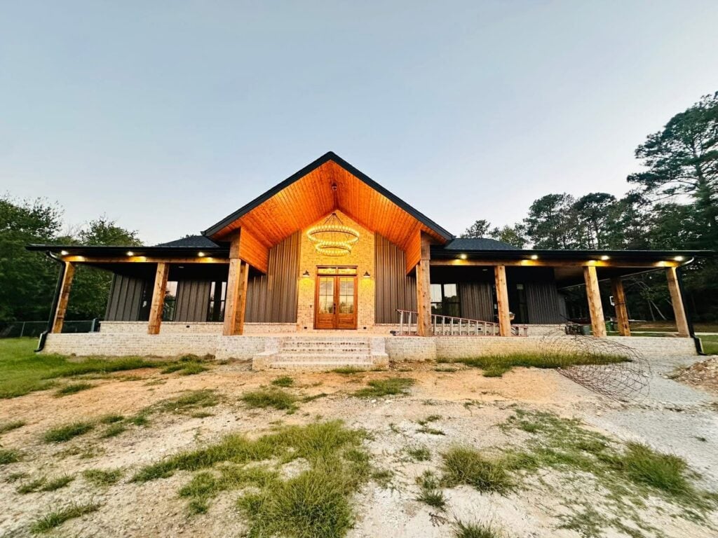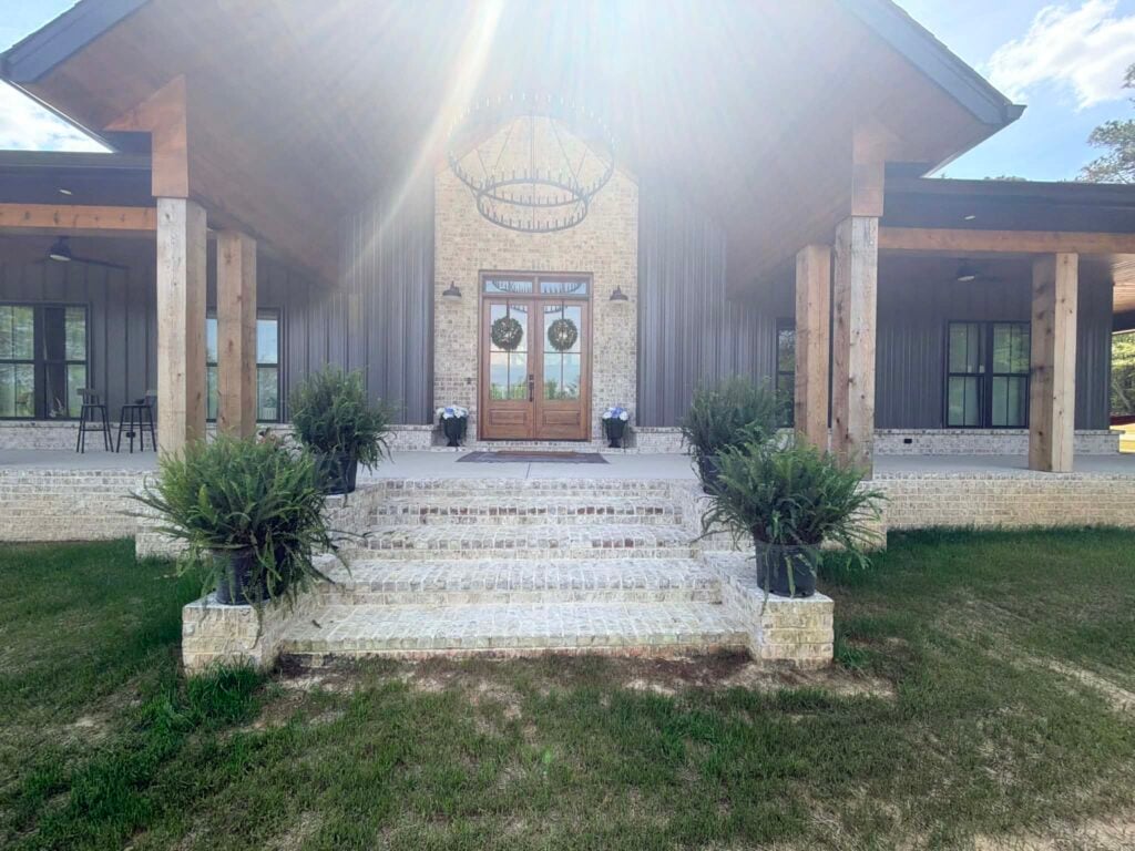 - The Twilight Transformation: As the sun sets, strategic recessed lighting and the warm glow of the chandelier illuminate the brickwork, turning the home into a striking beacon in the Alabama countryside.