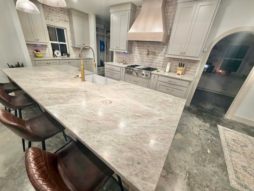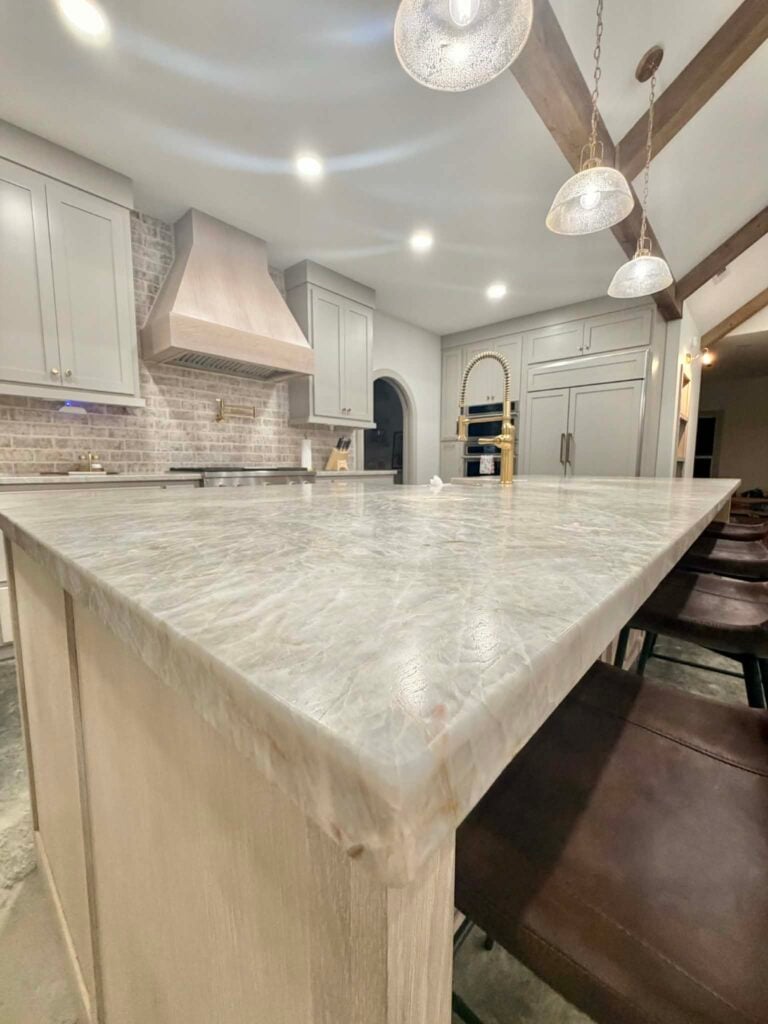 - The Island: The kitchen is anchored by an expansive island topped with a breathtaking, translucent quartzite. The natural veining is highlighted by elegant glass pendant lights.