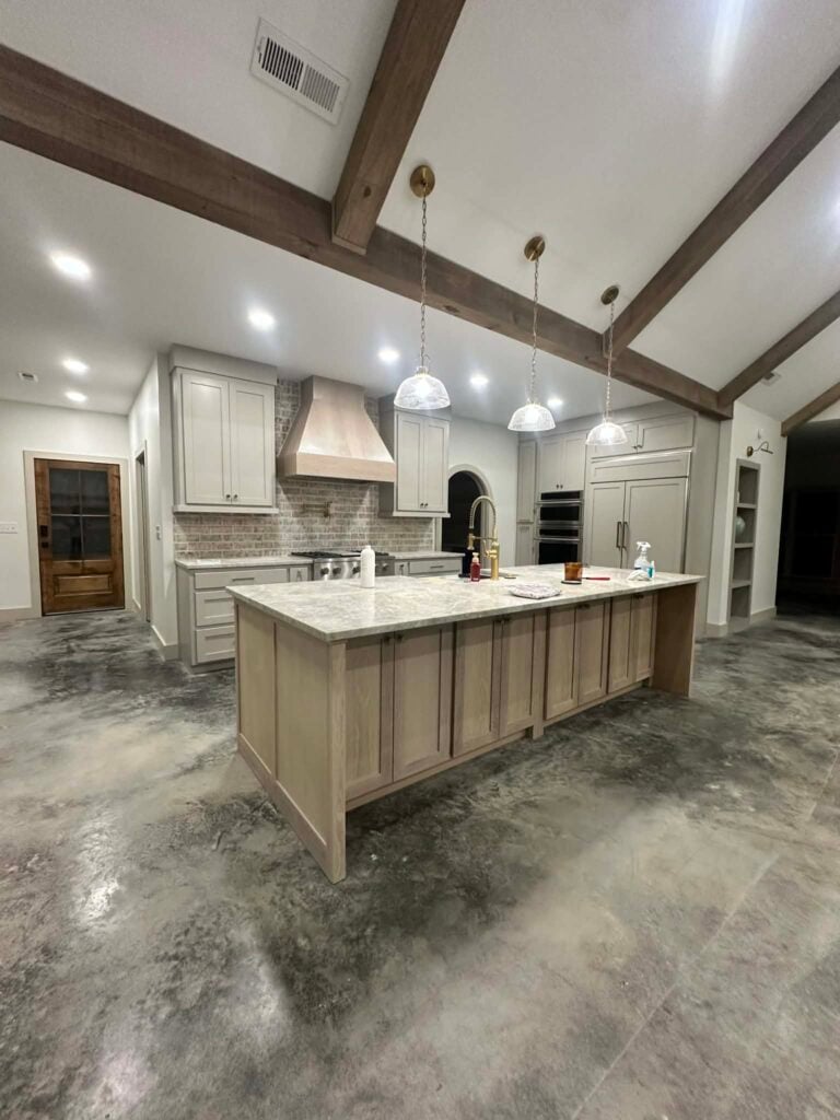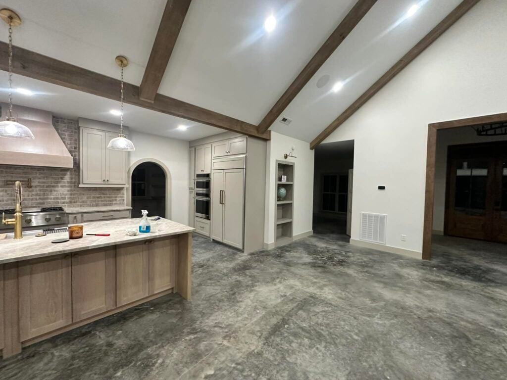 - Flooring: Dark, polished concrete floors (which are heated) run throughout the home, providing a moody, industrial foundation that makes the neutral walls and warm wood accents pop.
