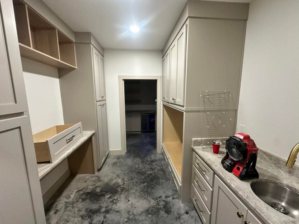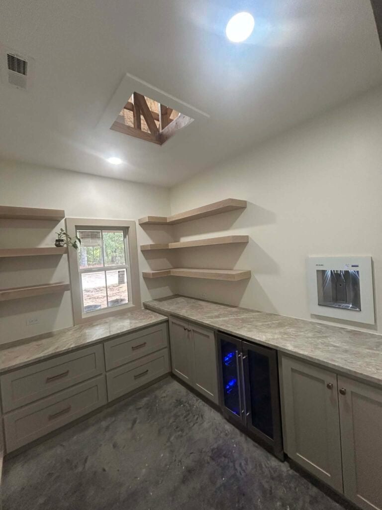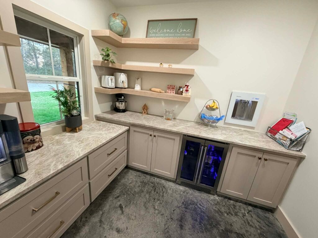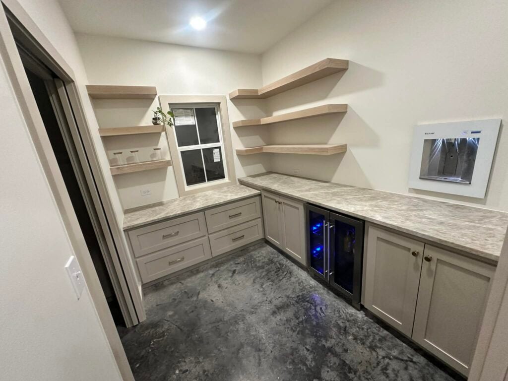 - The Butler’s Pantry/Coffee Bar: Tucked away for convenience, this area features light-grey cabinetry, light-wood floating shelves, and a dedicated water-bottle filler.