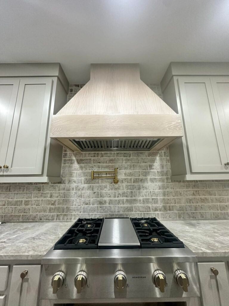 - The Culinary Center: Built for a chef, the kitchen features a professional Monogram gas range with brass-accented knobs and a gold pot-filler. Above, a massive custom-built wooden vent hood sits against a full-height wall of white-washed brick.
