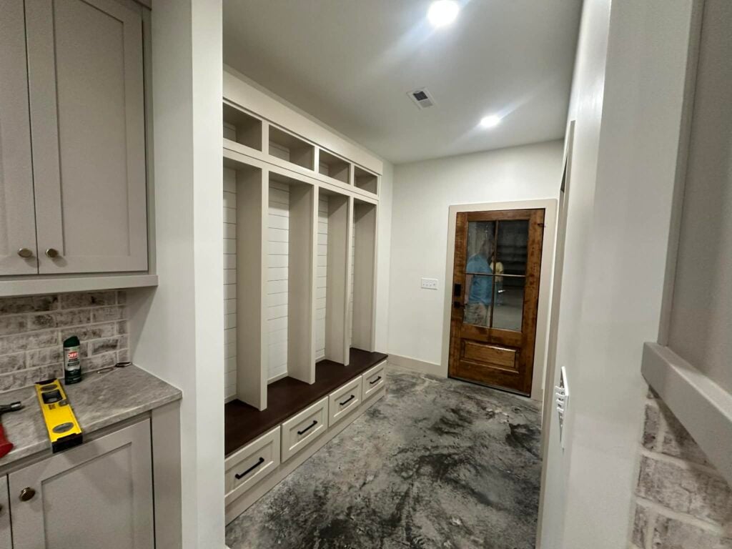 - The Mudroom Entry: The locker system combines deep-toned wood seating with crisp white shiplap, ensuring organizational efficiency feels like a high-end gallery.