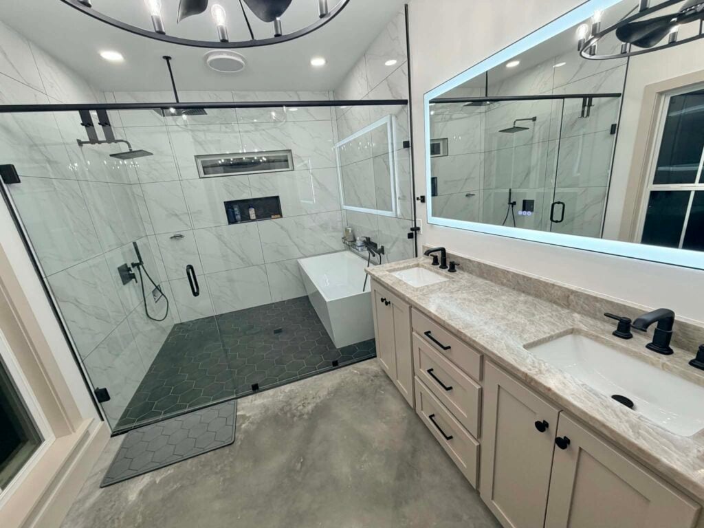- The Spa Bath: The primary bathroom is a tour de force, featuring a massive glass-enclosed wet zone with a freestanding soaking tub tucked behind a rainfall shower.