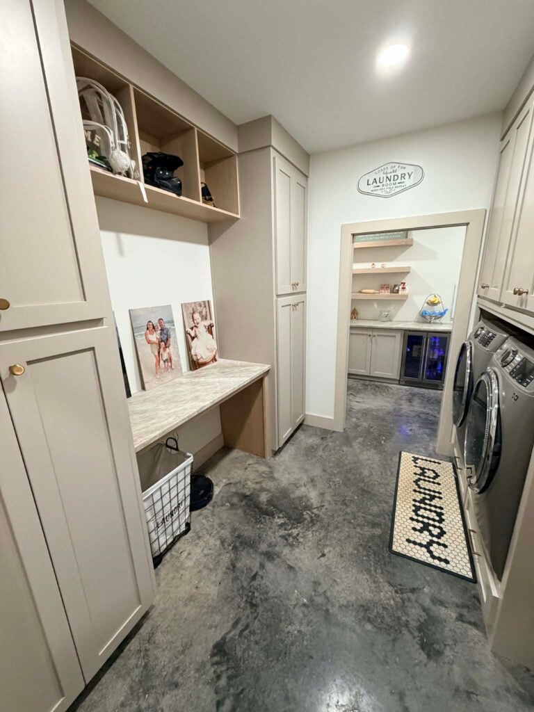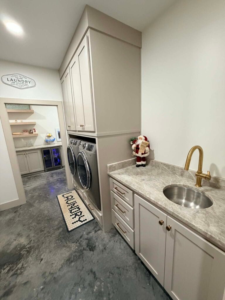 - The Laundry & Mudroom: Utility is elevated with custom cabinetry and a built-in dog washing station featuring a gold faucet. The “Laundry” themed hexagonal tile mat is a charming, bespoke detail.