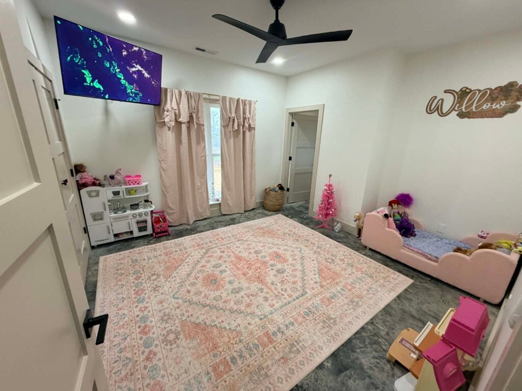 - Kids’ Rooms: Personalized and playful, these rooms use large-patterned rugs and bold colors to soften the industrial backdrop.