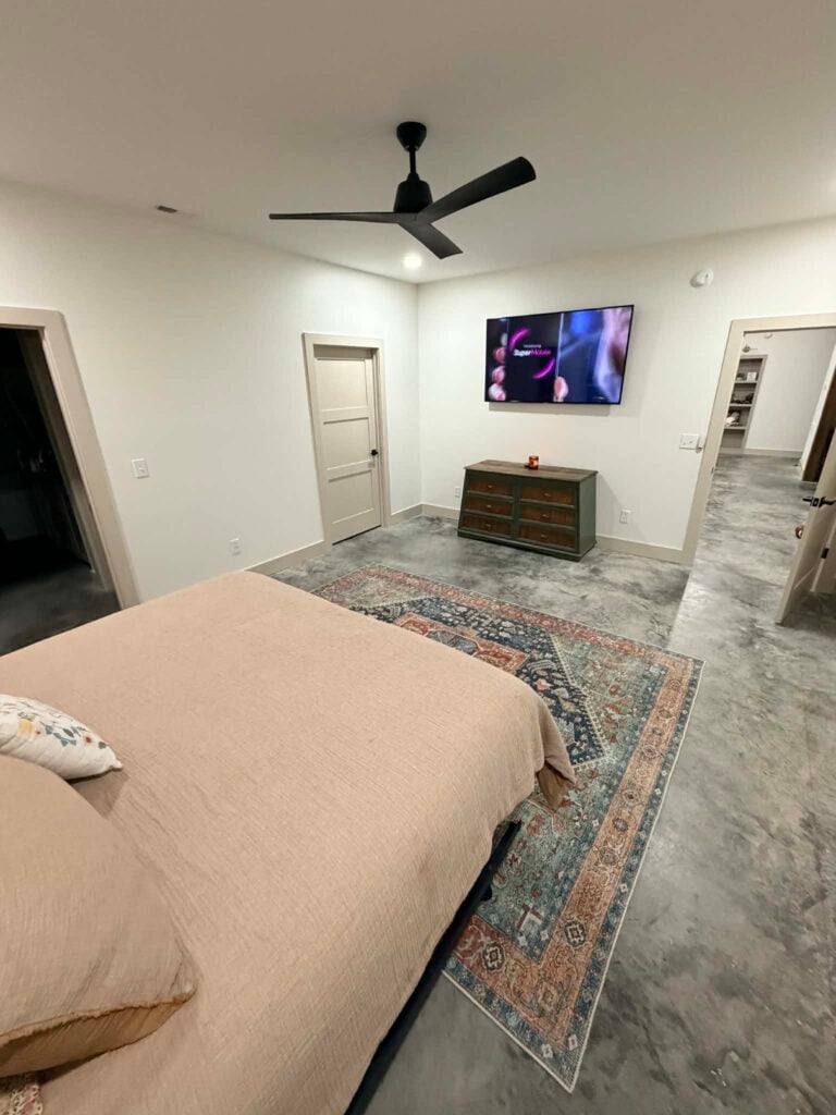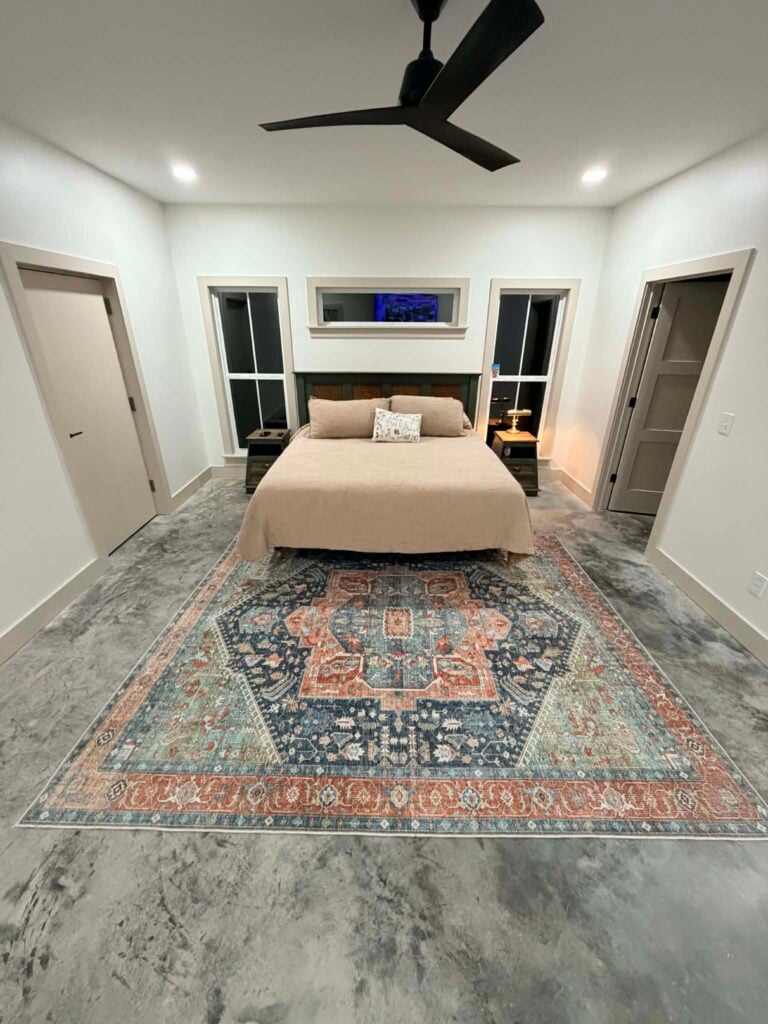 - The Primary Suite: Spacious and airy, the bedroom utilize large windows to frame the landscape, while vintage-inspired rugs add warmth to the sleek concrete floors.
