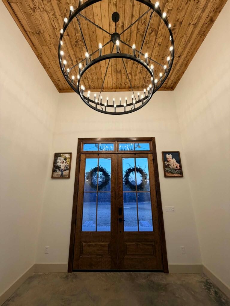 - The Chandelier: Hanging from the wood-planked ceiling is a colossal, two-tier circular chandelier that serves as a beacon of light, perfectly framing the custom stained-wood double doors.