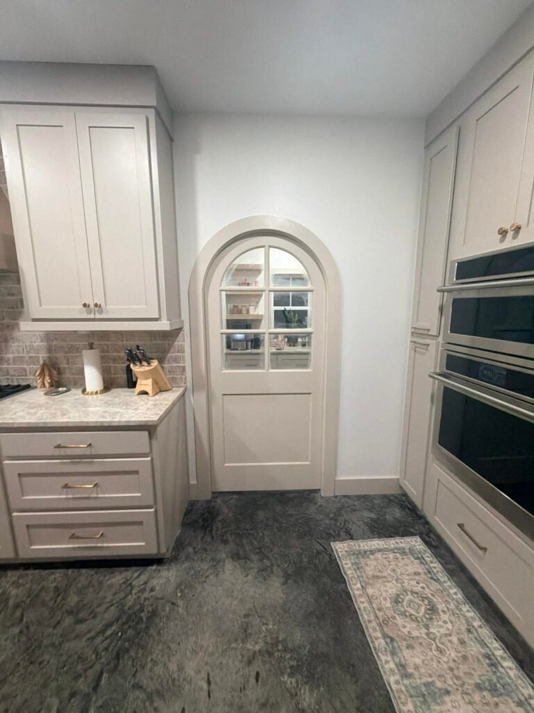 - Architectural Details: Note the arched “cloisters-style” pantry door. It’s a soft architectural touch that breaks up the clean lines of the custom cabinetry and high-end integrated appliances.