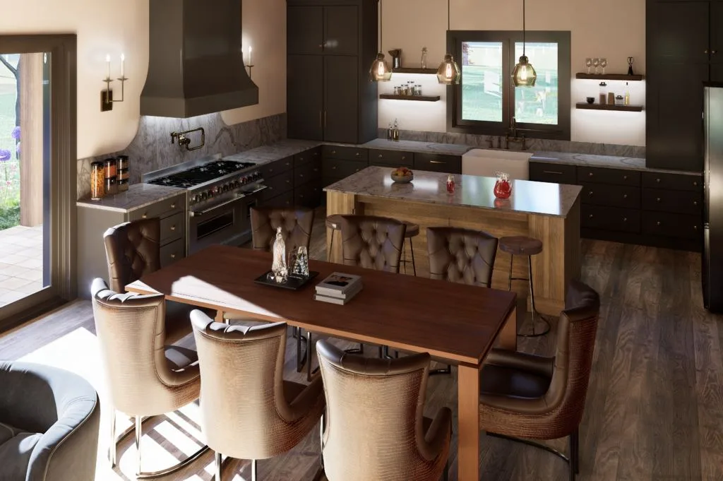 The interior of this barndominium radiates a sophisticated yet cozy warmth, anchored by a stunning vaulted ceiling with exposed wood beams and planks. An open-concept design seamlessly connects the living and dining areas with a gourmet kitchen. This kitchen makes a dramatic statement with its sleek, dark cabinetry and a luxurious, veined marble countertop that extends into a full-height backsplash. Elegant pendant lights and warm, backlit shelving enhance the moody and inviting atmosphere, perfectly balancing rustic architecture with contemporary refinement.