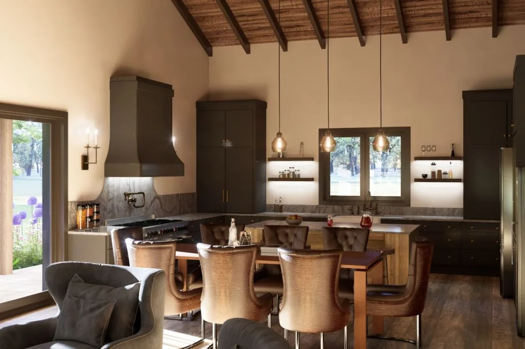 Step into an open-concept sanctuary where rustic character meets refined elegance. A dramatic vaulted wood ceiling presides over the unified living, dining, and kitchen areas, adding immense warmth and architectural interest. The kitchen serves as a stunning focal point, featuring minimalist dark cabinetry and a bold, custom range hood, all set against a luminous marble backsplash. With views of the outdoors and layered, ambient lighting, the space feels both expansive and intimate, creating a perfect backdrop for comfortable living and sophisticated entertaining.