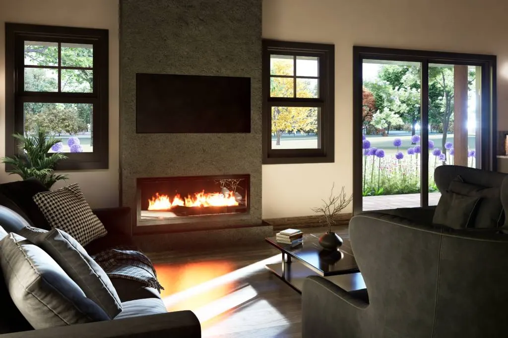 The living room’s heart is a magnificent floor-to-ceiling fireplace, clad in large, dark slate tiles that create a dramatic and textured focal point. A contemporary linear firebox casts an inviting, warm glow across the wood floors, establishing a cozy ambiance. This feature wall cleverly integrates an entertainment center, maintaining a clean, modern aesthetic. Flanked by large windows and a sliding glass door, this comfortable seating area offers the perfect place to relax while enjoying picturesque views of the lush garden just outside.