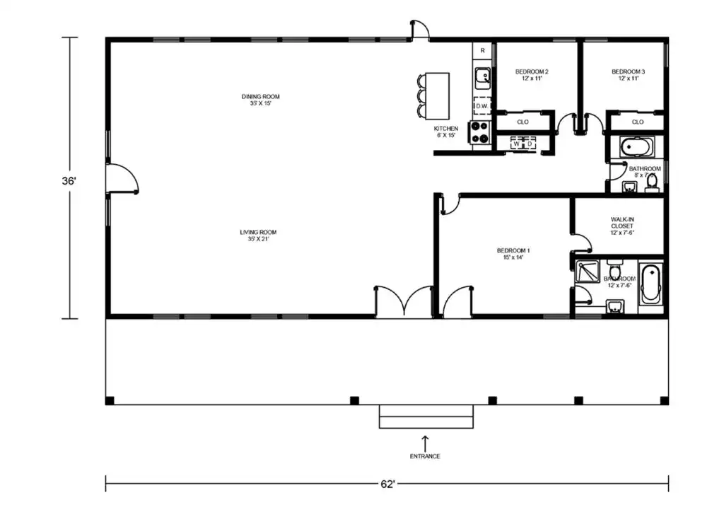- This floor plan presents a 62′ x 36′ barndominium design featuring three bedrooms and two bathrooms.