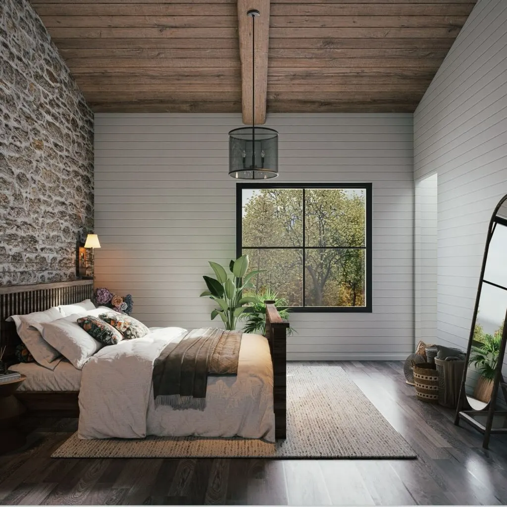 Step inside the master bedroom, where rustic charm meets elegant design to create a peaceful and inviting retreat. The vaulted ceiling with exposed wood beams adds a sense of spaciousness, while a feature wall of natural stone brings an organic, grounded feel to the space. A large window frames a beautiful view of the outdoors, filling the room with natural light and making it feel even more open. The dark-stained wooden bed, clean white walls, and plush rug create a perfect balance of textures and tones. This room is a true sanctuary, designed for ultimate relaxation and a deep connection with nature.