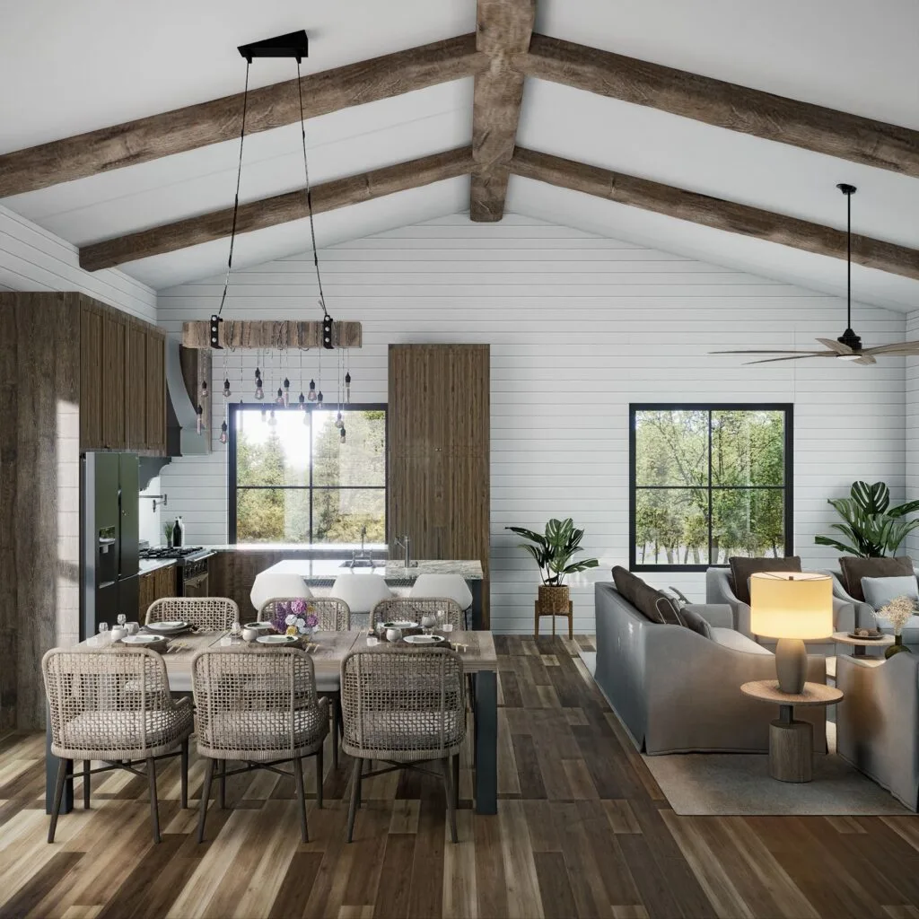 The living room is a masterpiece of rustic elegance, with exposed wooden beams stretching across the high ceiling, adding warmth and architectural interest. Two large windows frame the picturesque outdoor landscape, filling the room with natural light and making you feel connected to the peaceful surroundings. The comfortable gray sofas and plush rug create an inviting space for unwinding, with a stylish ceiling fan providing a gentle breeze on a warm day. The seamless flow from the living room to the rest of the open-concept living space ensures a perfect blend of comfort and functionality. This is a space designed for relaxation and appreciating the beauty of both the interior and the outdoors.