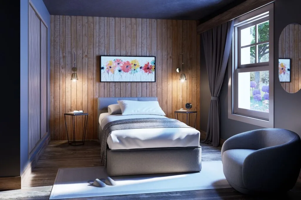 Now, we enter a tranquil and cozy guest bedroom, designed to provide a comfortable and stylish retreat for visitors. The room’s serene atmosphere is created by the blend of a rustic wood accent wall and a dark, moody ceiling, providing a sense of intimate enclosure. A plush, upholstered bed with its minimalist frame and crisp linens invites a restful night’s sleep. The space is completed by a small armchair, a set of modern side tables, and a full-length oval mirror, all of which contribute to a sophisticated and welcoming feel. This room perfectly balances rustic warmth with contemporary design, ensuring guests feel right at home.