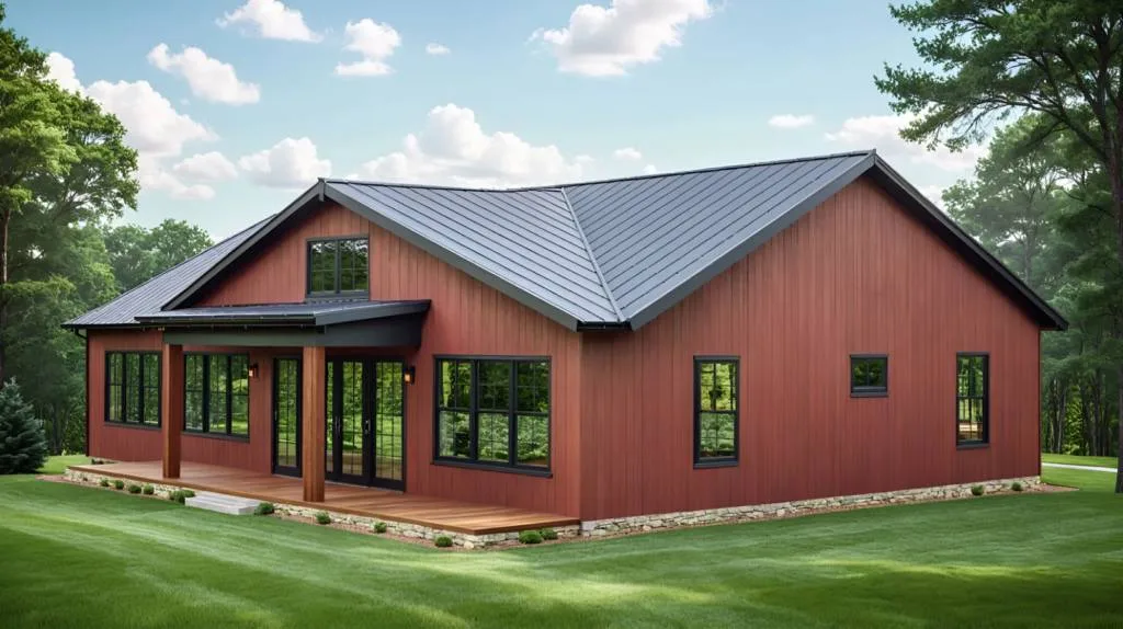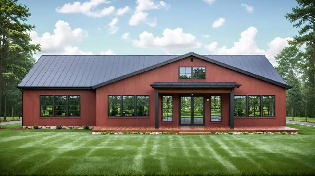 Our new tour begins by admiring the beautiful and striking exterior of this red barndominium, a true statement of modern farmhouse design. The vibrant crimson siding with its vertical lines offers a bold, welcoming presence, perfectly complemented by the contrasting black metal roof and window frames. The gabled porch with its exposed wooden beams and a black trellis over the patio door adds a touch of rustic charm, creating a sheltered space for quiet evenings. Large, black-framed windows and a glass patio door flood the interior with natural light, blurring the lines between the inside and the lush, forested landscape. This home stands as a stunning example of how to make a bold color choice feel both elegant and timeless.