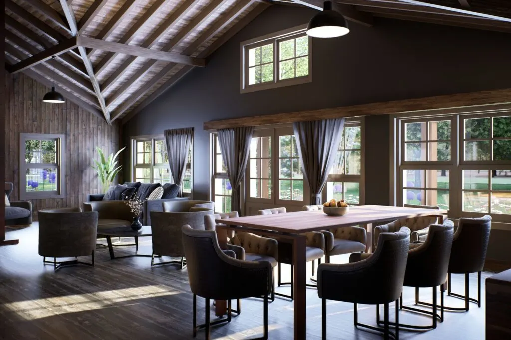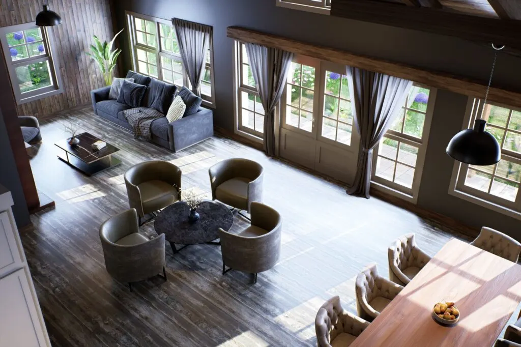 From this elevated perspective, we are presented with a magnificent overview of the home’s stunning living room. The vast, open space is thoughtfully arranged with two distinct seating areas: a cozy, central circle of chairs for intimate conversations and a larger sofa for relaxation. The room is bathed in sunlight, pouring in from the extensive windows and glass French doors that open to the outdoors. The rustic wooden floor and vaulted ceiling with exposed beams create a warm, inviting atmosphere, while the modern gray and black furniture provides a sophisticated contrast. This room is a perfect blend of rustic and contemporary elements, designed to be the heart of a home that loves to entertain.