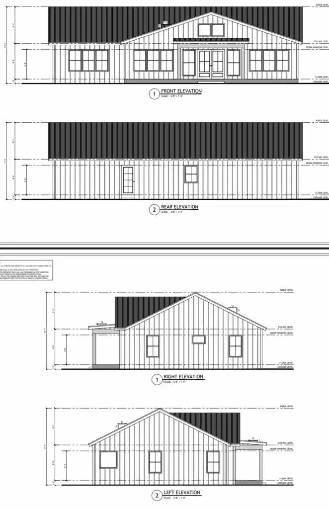 Moving from the vibrant renders, we now get a comprehensive look at the home’s architectural master plan through its elevations. The Front Elevation provides a clear blueprint of the home’s inviting facade, showcasing the perfect symmetry of its windows, doors, and covered porch. From this detailed drawing, we can appreciate the careful placement of each element, revealing a design that is both balanced and functional. The Rear Elevation continues the story, showing how the home presents a private, yet equally attractive, face to the back of the property. The side elevations reveal the home’s impressive profile, with the consistent roofline reinforcing its timeless, barn-inspired architecture.