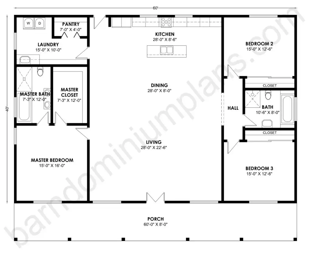 - This three-bedroom, two-bath plan measures 60′-0″ x 40′-0″ overall.