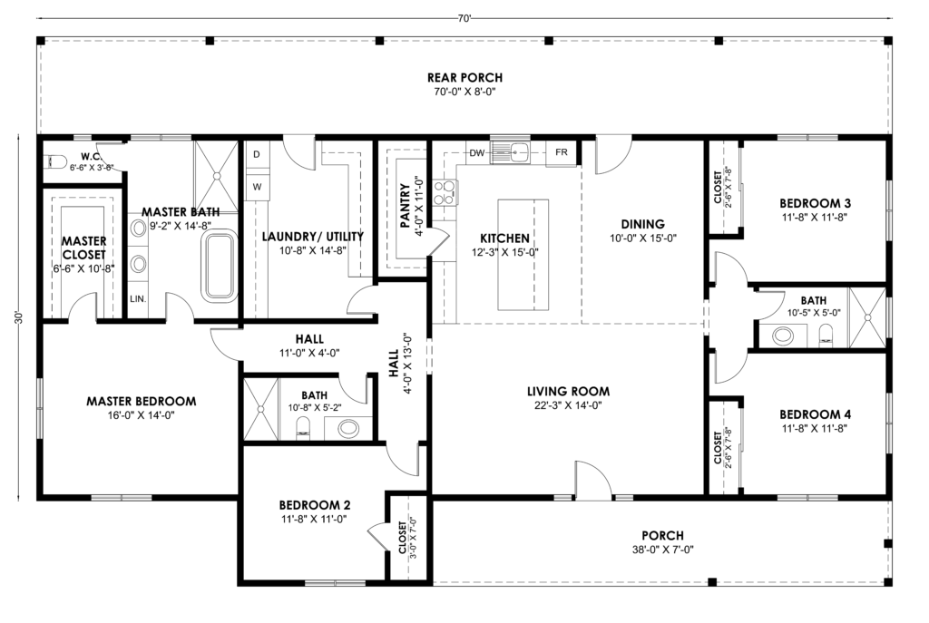 - Outdoor living shines with a generous 38′-0″ x 7′-0″ front porch and an expansive 70′-0″ x 8′-0″ rear porch, offering plenty of space to enjoy classic farmhouse-style outdoor living.