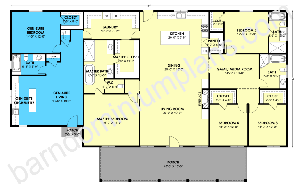 - On the left, a comprehensive Gen-Suite provides a self-contained lifestyle with its own 13′-8″ x 18′-5″ living area, kitchenette, and a private 14′-0″ x 12′-0″ bedroom.