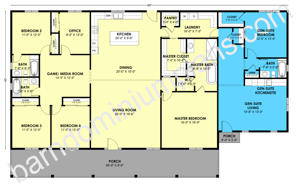 - A self-contained Gen-Suite occupies the far right of the plan, providing a 19′-8″ x 13′-0″ living area with a kitchenette and a private 12′-0″ x 13′-0″ bedroom.