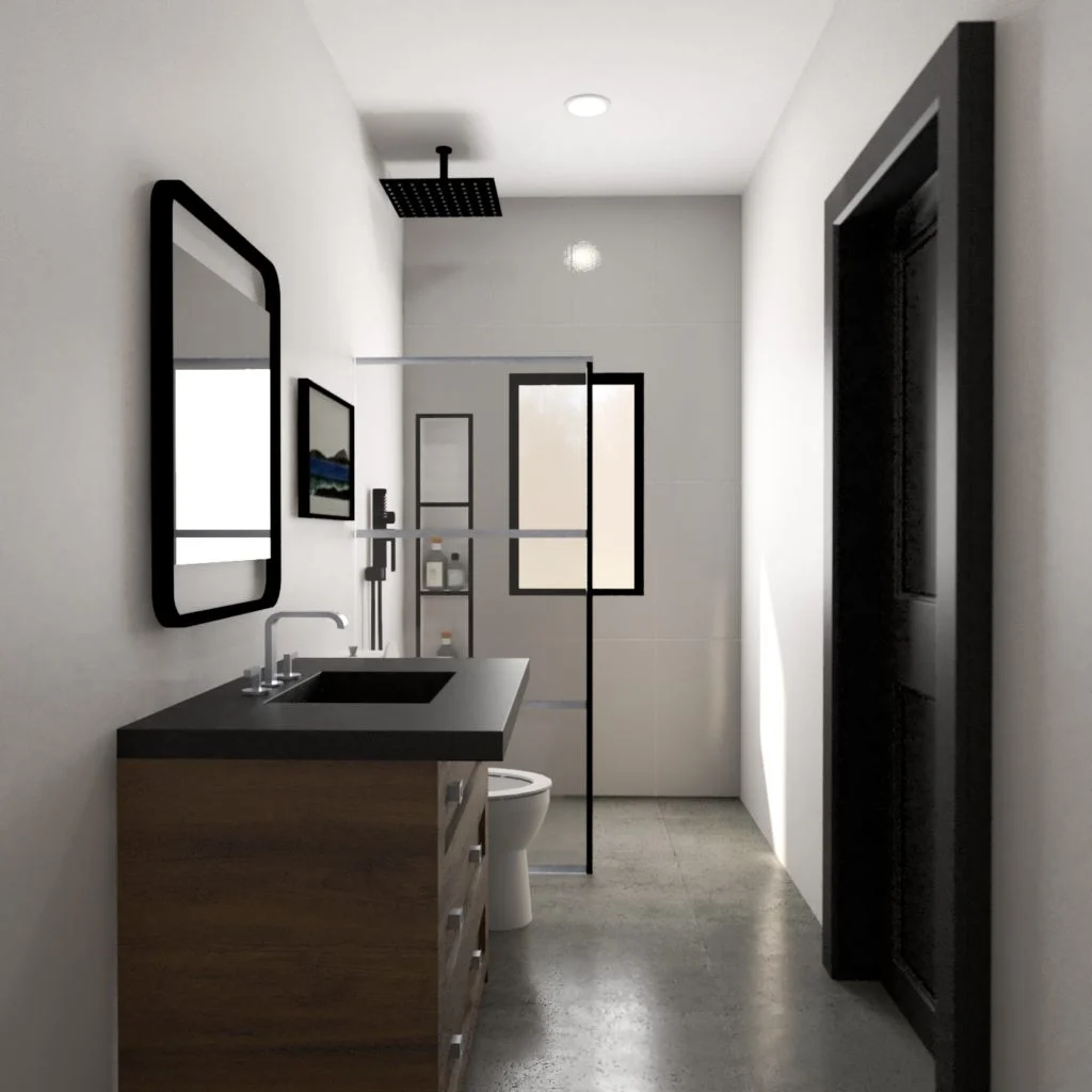 The home’s sophisticated design language is flawlessly carried into the bathroom. A rich wood vanity with a dark, solid countertop provides an organic contrast to the sleek, polished concrete floor. Bold black accents create a cohesive and modern look, seen in the door, the rounded-corner mirror, and the fixtures of the walk-in shower. This spa-like space is completed with a luxurious ceiling-mounted rain shower head, blending high-end functionality with the home’s signature contemporary style.