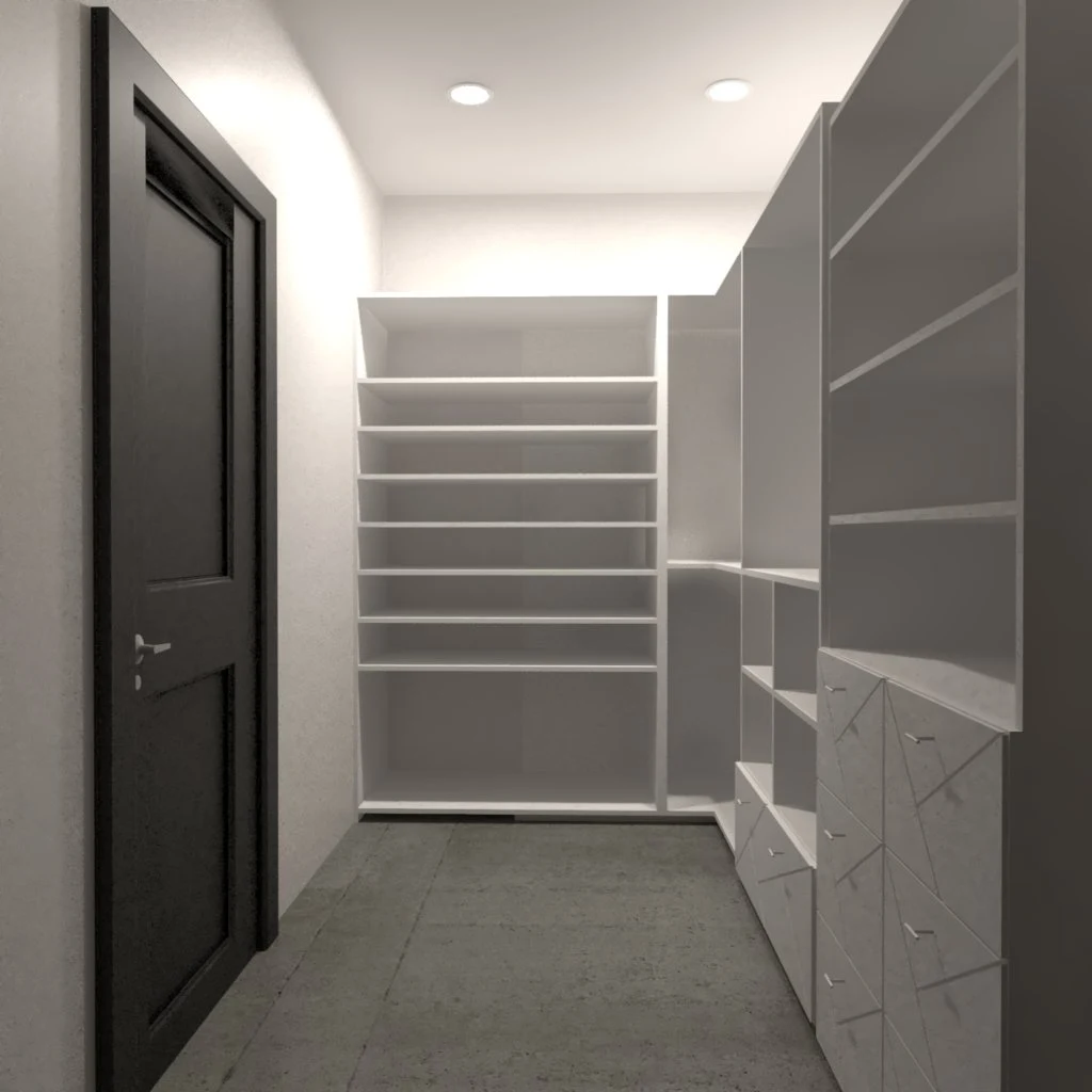 This barndominium’s walk-in closet offers a sleek and modern approach to organization. The space is efficiently designed with floor-to-ceiling custom white shelving, providing ample room for shoes and folded items. A bank of drawers with a contemporary geometric pattern adds a stylish touch, while the dark, modern door creates a striking contrast within the bright, minimalist space.