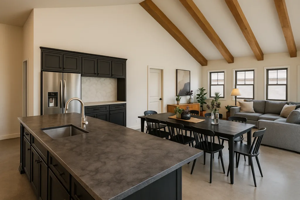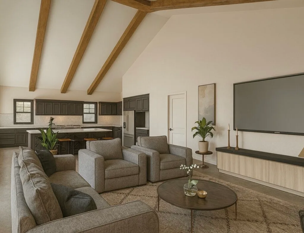 Here we have a glimpse into the heart of the home, showcasing the perfect blend of style and function. The open-concept living area features a soaring vaulted ceiling with exposed wooden beams, creating a sense of rustic elegance. The living room, complete with a cozy sectional and a mounted TV, seamlessly transitions into the modern kitchen with dark cabinetry and a large island. This space is designed for both entertaining and everyday living, making it the perfect hub for family and friends.