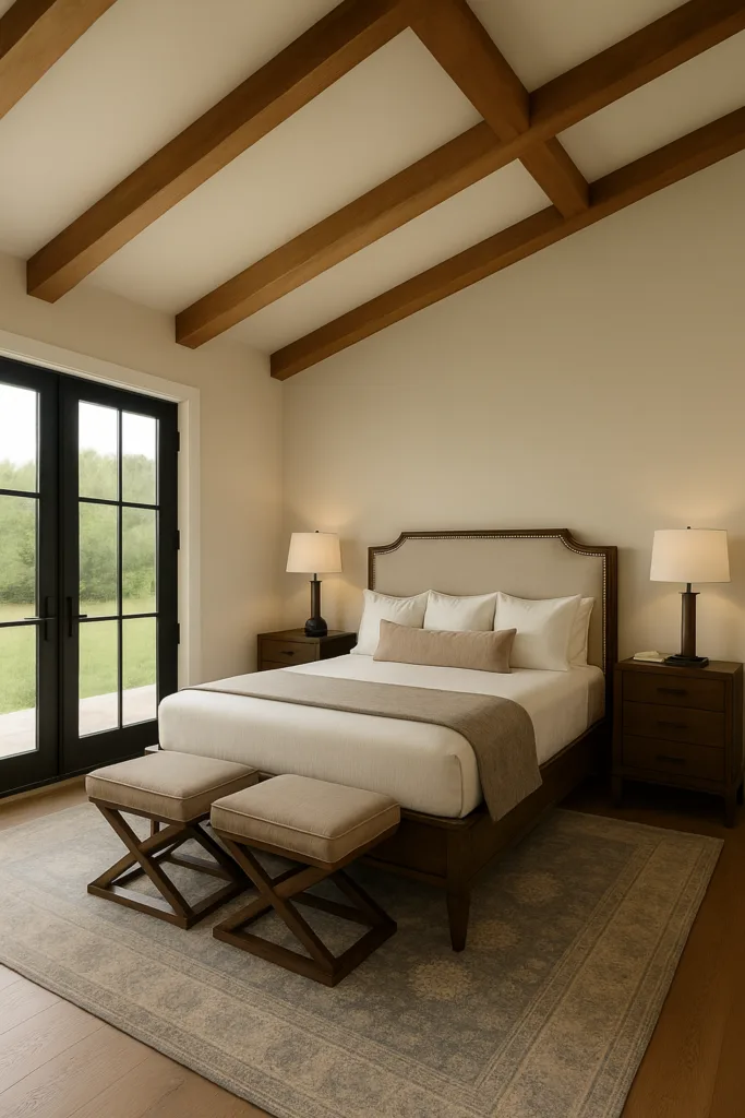Discover the comfort and tranquility of the master bedroom, a perfect sanctuary for rest and relaxation. This inviting space features a vaulted ceiling with rustic wood beams, echoing the design elements of the main living area. French doors open to a serene view of the outdoors, filling the room with natural light. The sophisticated bed frame and matching nightstands create a peaceful and elegant atmosphere, inviting you to unwind at the end of the day.