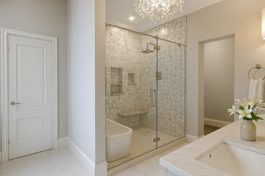 Take a closer look at the master bathroom, a space designed for ultimate relaxation and luxury. This elegant shot highlights the standalone soaking tub and the expansive walk-in shower with its beautiful tile surround. The dual showerheads offer a high-end, customizable experience, while the chic chandelier adds a touch of sophisticated sparkle. The double vanity, just out of view, and the large mirror make this a truly functional yet lavish space.