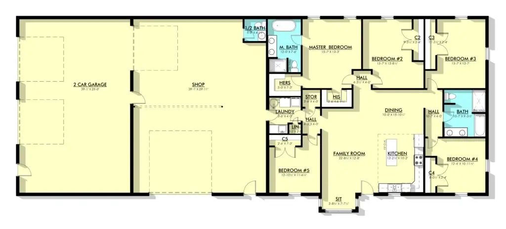 - This floor plan features a spacious 39’ x 29’ shop, providing ample room for various activities. With its generous dimensions, you can set up anything to suit your needs.