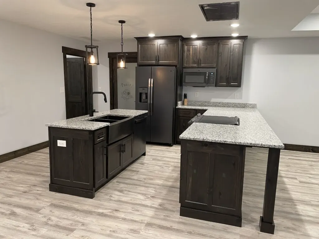 Thanks to the stainless steel appliances, this kitchen has a sleek and clean look. The countertop color choice is perfect for tying in all the colors. From the brown cabinets to the light shade color chosen for the floors! The counter even hangs over allowing you barstool seating to help minimize the need for a kitchen table. This feature really helps allow more room in your living space not needing a table to eat at.