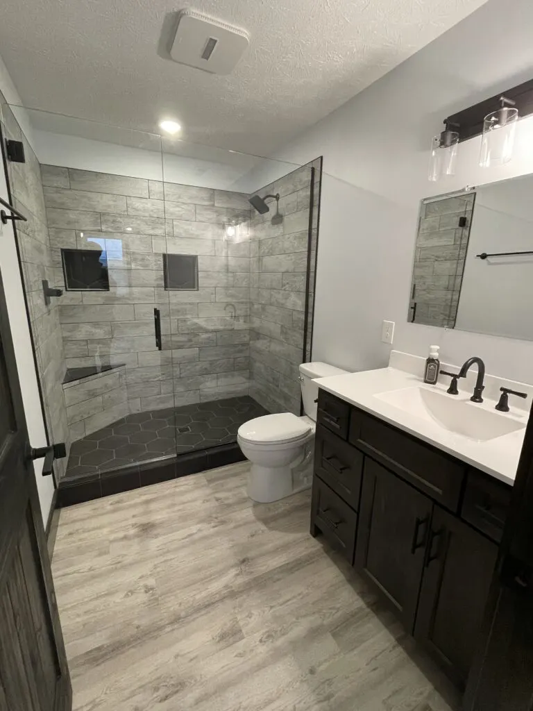 Like the other walls in the home, the bathroom walls have nice clean white paint. Giving it a nice calm feeling as you enter. The same flooring is also used in the bathroom that has been in all the other living spaces of this house. The highlight of this bathroom is the tiled walk-in shower. Notice the black tile flooring that really gives this shower more personality. Which helps tie in the black hardware used. Let’s not forget the built-in ledge to sit on and two square shelves to store your shampoo and soap really make this shower a dream!
