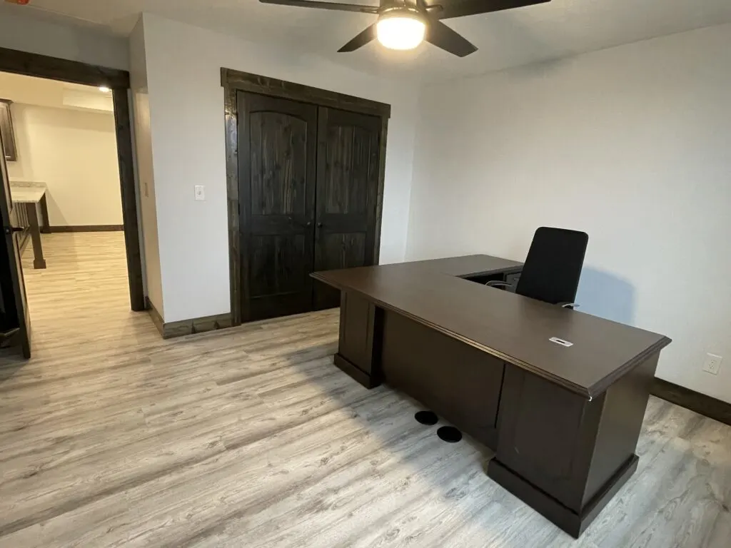 To the right of the kitchen is a small office with a double-door closet. This small office has plenty of space for a desk and storage. It’s perfect if you need somewhere separate from your living area to work or store personal items. This closet would be the perfect place for storing personal items or maybe extra coats and decor pieces if needed. Note the ease of electric outlets on the floor allowing you easy access to electricity from the desk to plug in all your cords with ease.