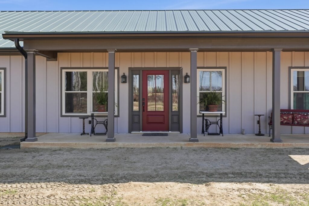 The Red Door Welcome: A rich red front door acts as a classic focal point, framed by deep-set porches and dark structural columns.