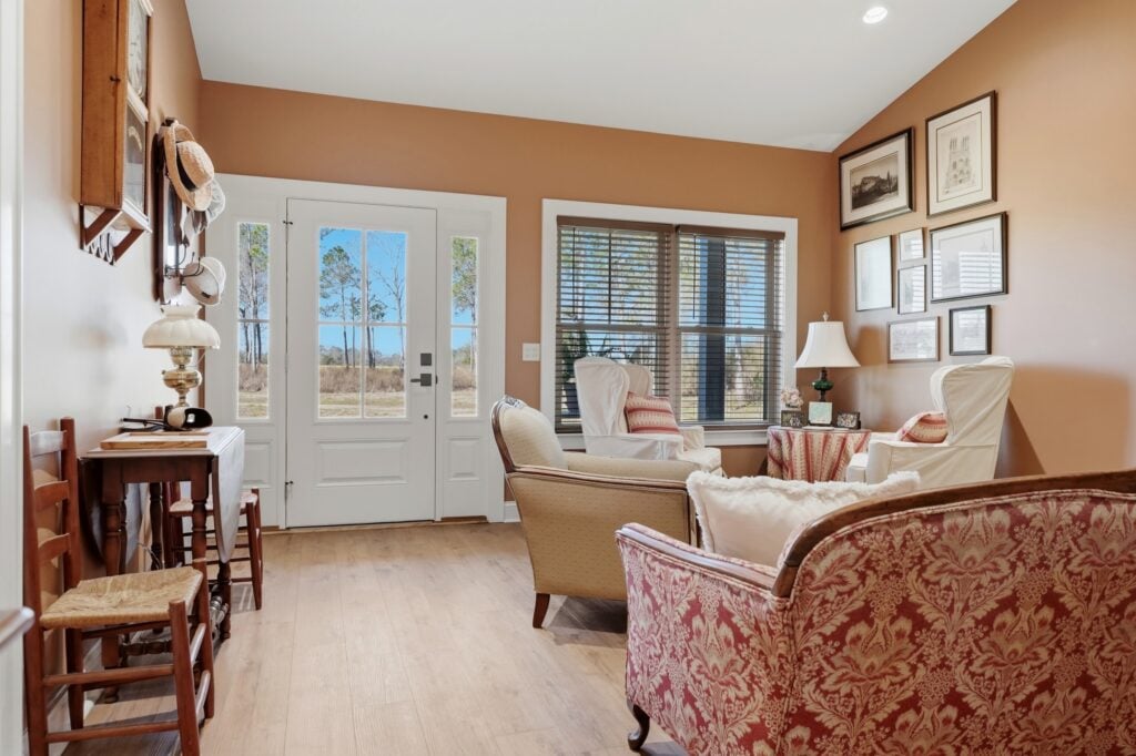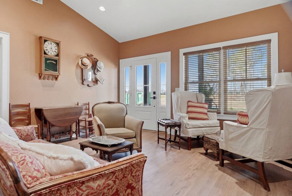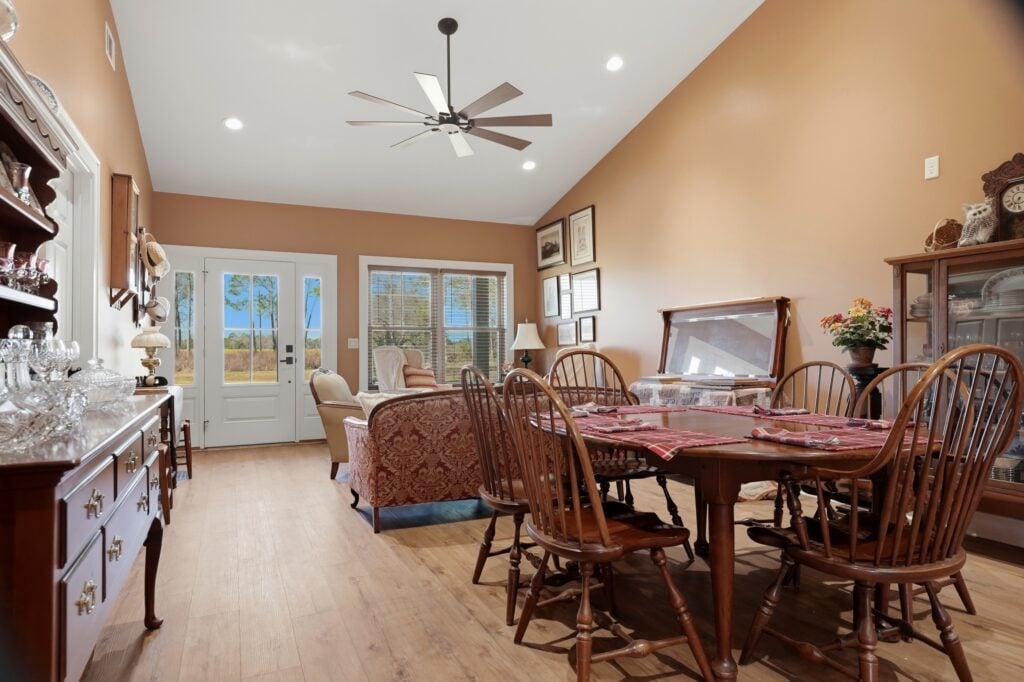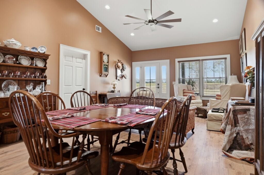 The dining and sitting areas maintain a “Heirloom Comfort” feel. A large, dark wood oval table with traditional spindle-back chairs sits adjacent to a sitting room filled with white wingback chairs and a unique wall display of vintage straw hats. This isn’t just a house; it’s a gallery for a life well-lived.