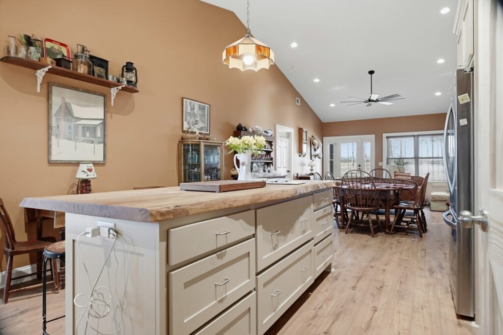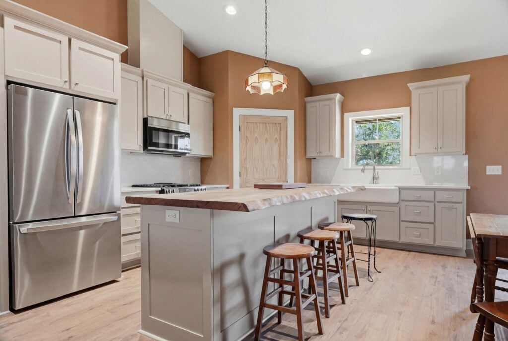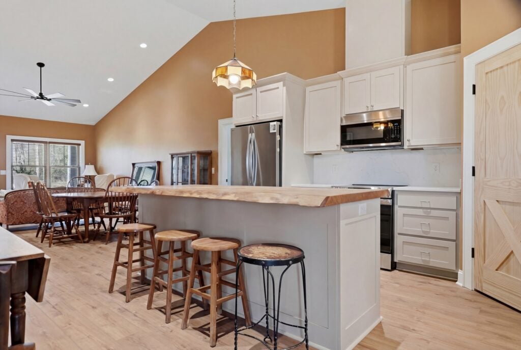 Live-Edge Artistry: A massive live-edge wood island countertop provides a natural, sturdy centerpiece for the room.