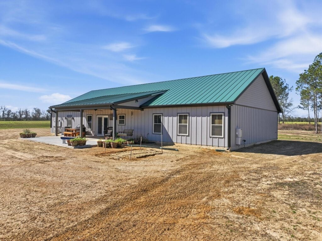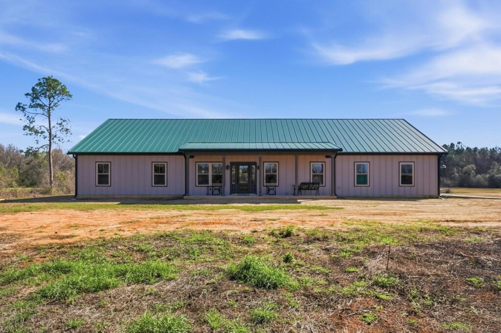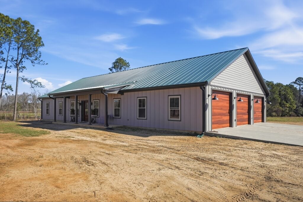 Vibrant Contrast: The home features a vibrant emerald green metal roof that provides a sharp, colorful pop against the soft, lavender-gray board-and-batten siding.
