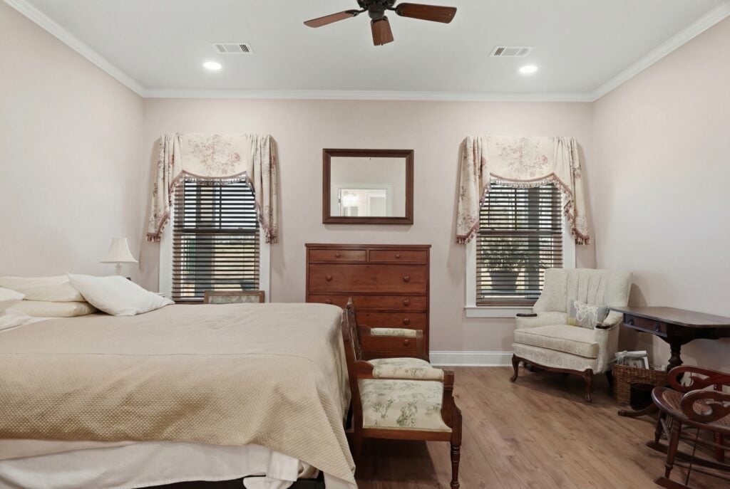 Aesthetic: The main bedroom serves as a serene retreat featuring soft, mauve-toned walls and traditional floral window valances.