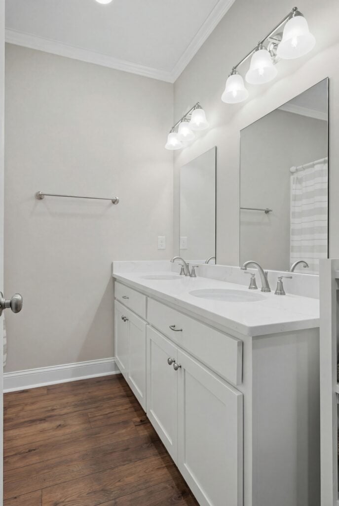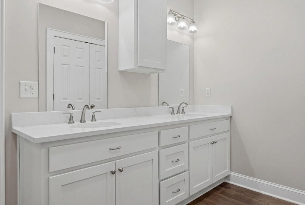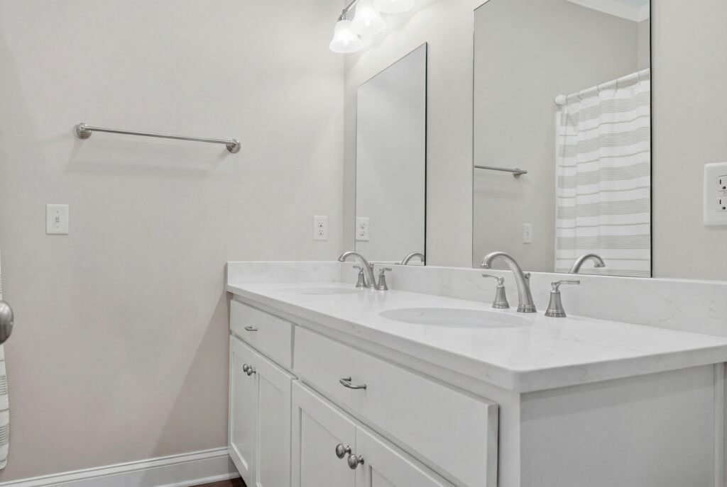 Design: These spaces maintain the high-end aesthetic with white double vanities and polished nickel hardware.