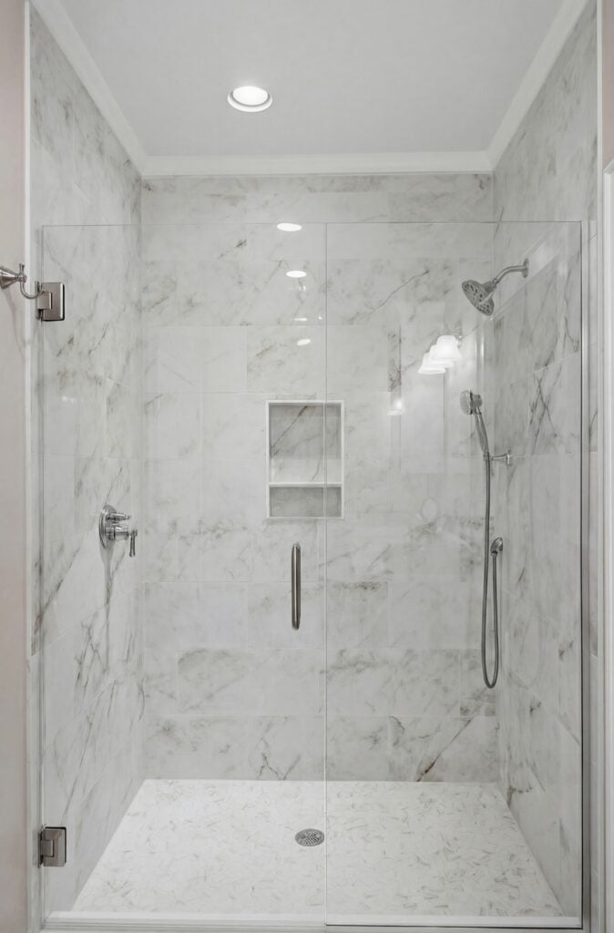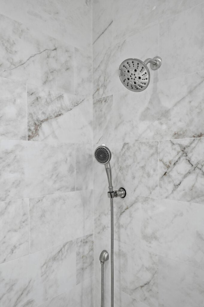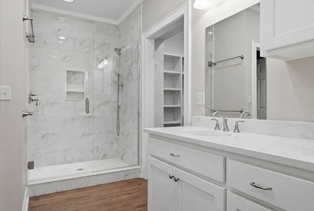 Primary Bath: This en-suite includes a long white double vanity with marble-look quartz and a luxurious, floor-to-ceiling walk-in shower finished in large-format marble tile.