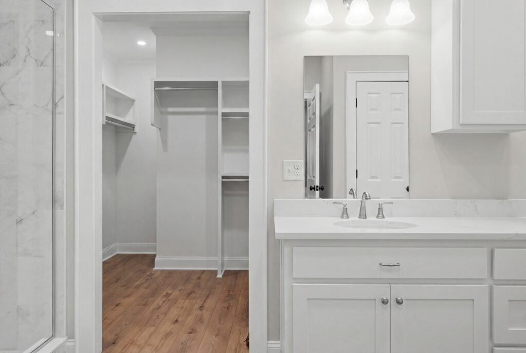 Organization: The bathroom leads directly into a spacious walk-in closet featuring custom built-in shelving.