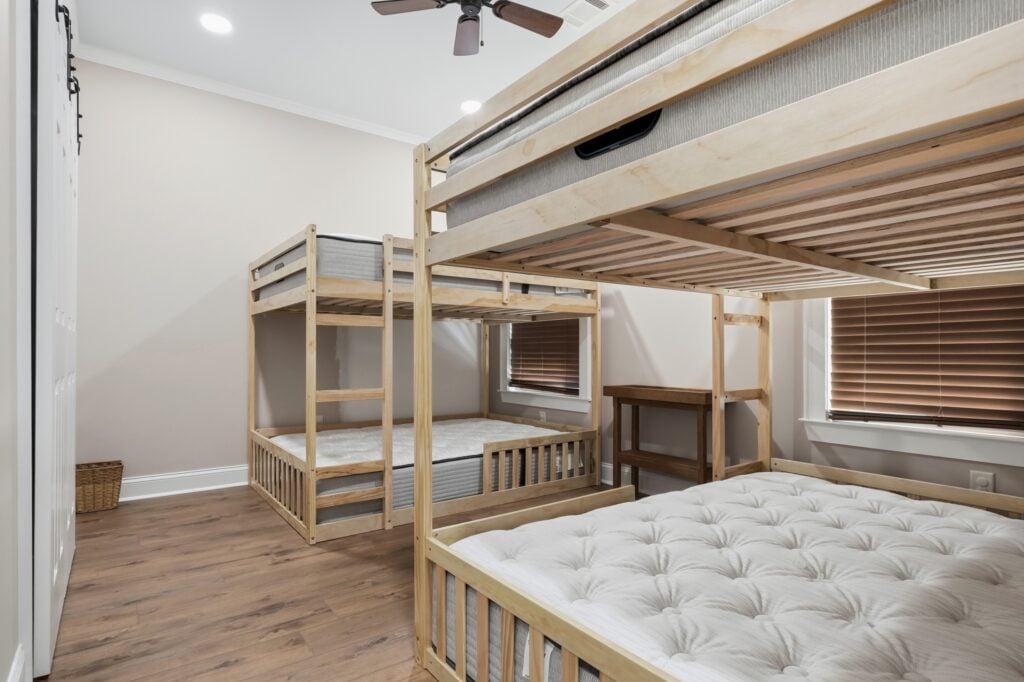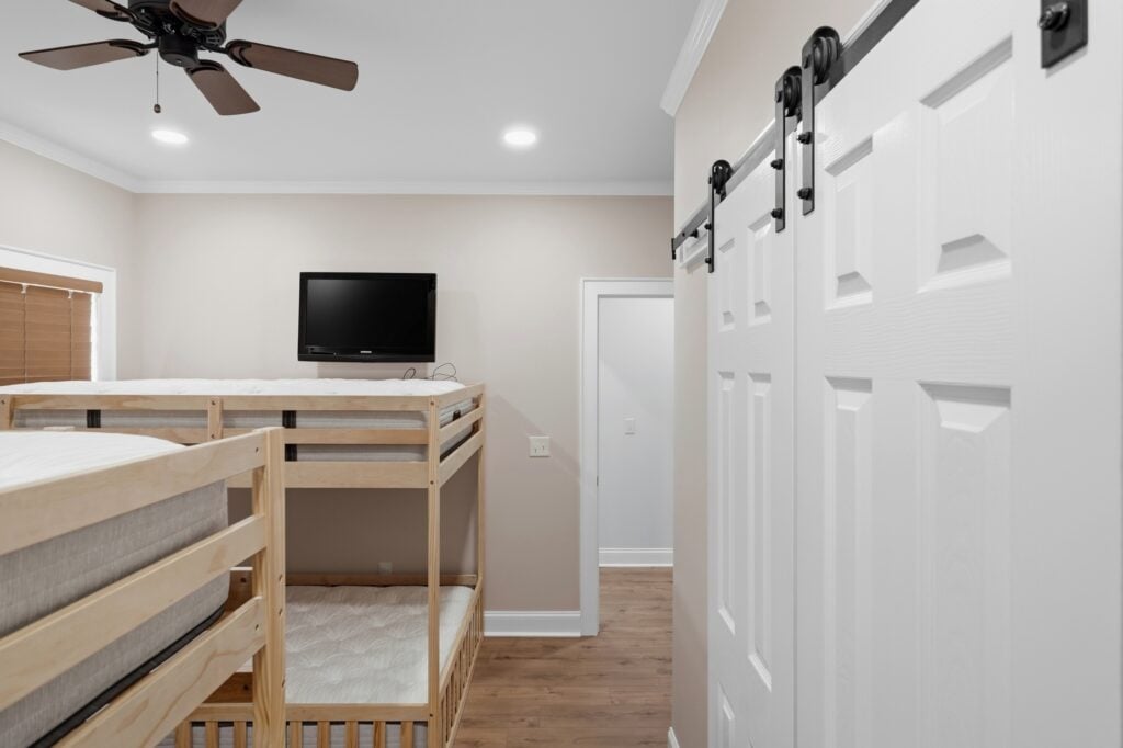The Bunk Room: Optimized for space with two sets of natural wood bunk beds and white sliding barn doors for the closet.