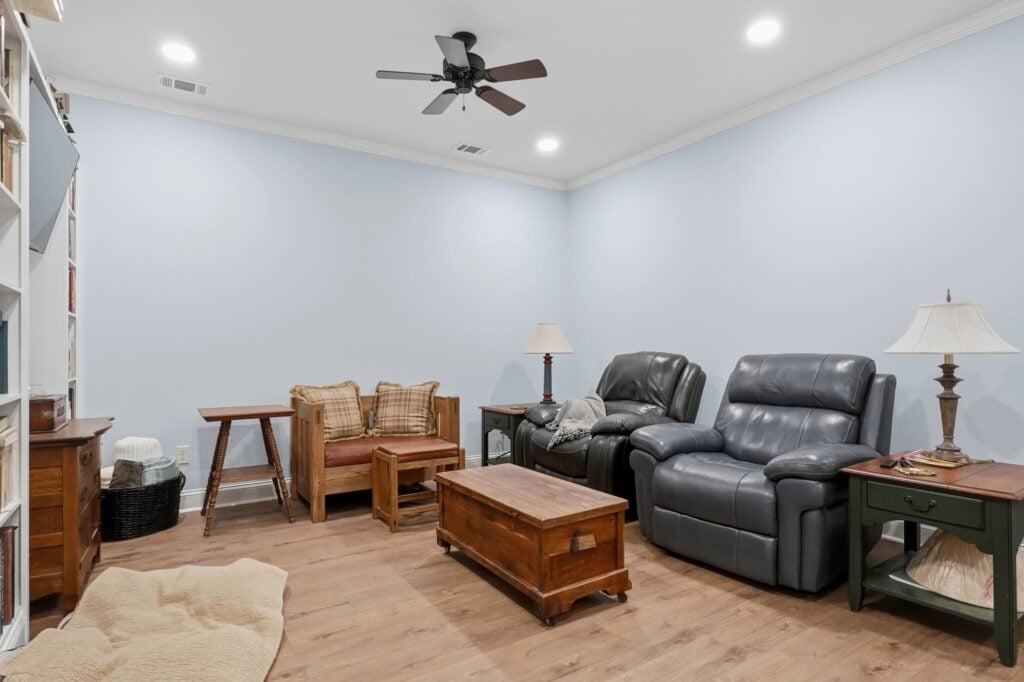 - The Hub Room: A specialized family or media room includes a classic roll-top desk, a built-in library wall, and plush leather recliners for the ultimate movie night.